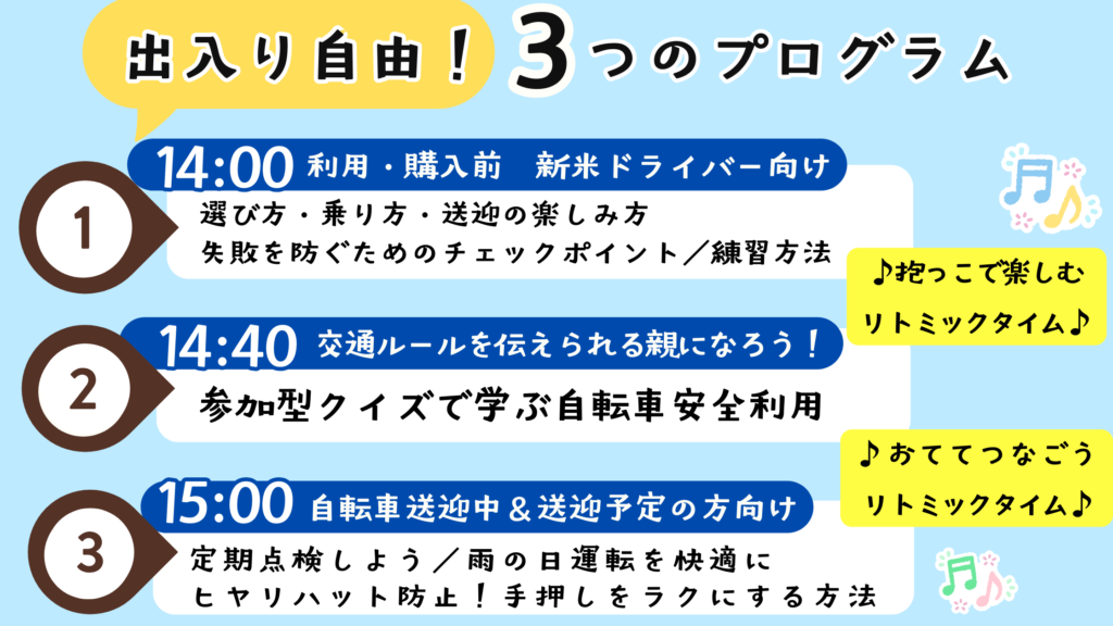 参加型クイズで楽しみながら自転車の安全利用を学べるプログラムや、親子のふれいあいリトミックをお届けします!