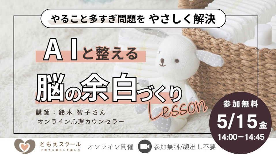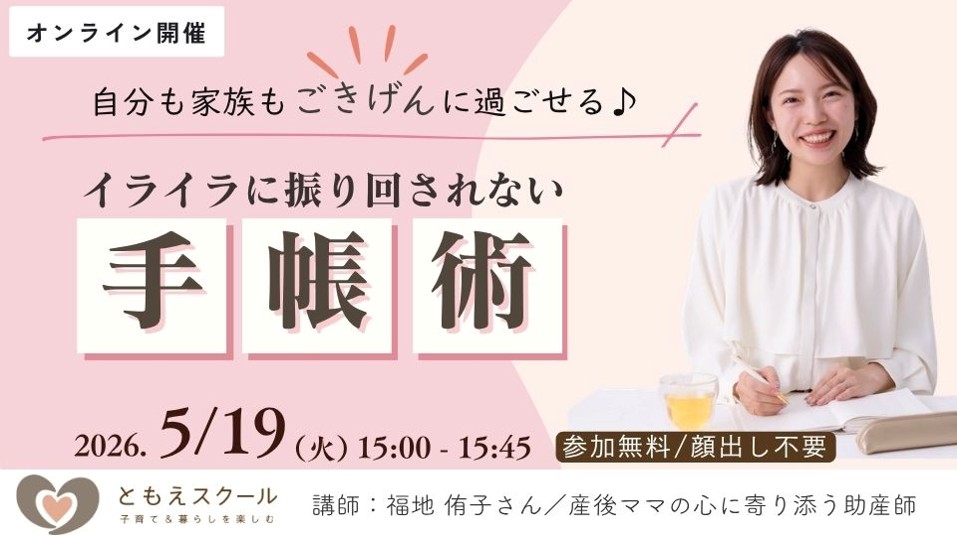 TAG 親向け講座 5/26(火)14:00〜 重ね煮で叶える!あんしん離乳食・幼児食 2026.04.18 親子ひろば UCHIMURA ともえスクール 5/19(火)15:00〜自分も家族もごきげんに過ごせる♪イライラに振り回されない手帳術 2026.04.18 親子ひろば UCHIMURA ともえスクール 5/15(金)14:00〜やること多すぎ問題をやさしく解決 〜AIと整える「脳の余白」レッスン〜 2026.04.18 親子ひろば UCHIMURA ともえスクール 5/20(水)14:00〜ねんねお悩み相談室 公開!グループコンサル 2026.04.16 親子ひろば OGATA ともえスクール 5/13(水)14:00〜 歯科衛生士さんに教わる! むし歯ゼロ&歯並びの良い子に育てるために家庭できること 2026.04.16 親子ひろば OGATA ともえスクール 【スキルアップ講座】ファーストシューズの選び方講座の開き方\くつえらびアンバサダーは参加無料・オンライン開催/申込者にアーカイブ配信あり 2026.04.10 イベント KANAKO ともえスクール 4/20(月)15:00〜親子のぐっすりねんねを叶えよう! 初夏に向けたねんね対策&ぐっすり寝るための栄養 2026.03.20 親子ひろば UCHIMURA ともえスクール 4/9(木)14:00〜 3歳までの英語育児、何する?何しない?英語好きに育てたいなら知っておきたい『おうち英語』のロードマップ 2026.03.19 親子ひろば OGATA ともえスクール 4/22(水)15:00〜 産後のイライラ、あなたは悪くない!脳とホルモンの変化から学ぶ、今日からできる小さな整え方 2026.03.19 親子ひろば OGATA ともえスクール 4/22(水)14:00〜 『在宅ワーク』を覗いてみよう…!未経験から始める、無料デザインツールCanvaで広がる働き方の選択肢 2026.03.19 親子ひろば OGATA ともえスクール 1…78910111213…17